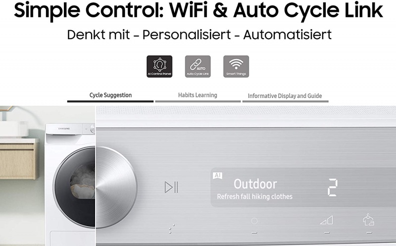 Inteligens szárítás, MI vezérlés>> Szárítsd ruháidat könnyen és hatékonyan az MI vezérlés segítségével. A mosási szokásaid alapján személyre szabott szárítást nyújt, mosási ciklusokat javasol és kijelzi a mosási idővel kapcsolatos információkat. A SmartThings Alkalmazás * a mosási ciklusokkal kapcsolatos tanácsokat ad, tervez és a hibaelhárításban is segít. És kiválasztja a mosási ciklusnak legmegfelelőbb szárítást. ** ( *Android és iOS eszközökön érhető el. Wi-Fi csatlakozás és a Samsung Account regisztráció szükséges. ** Az Automatikus Ciklus Összehangolás kizárólag akkor érhető el, ha a mosógép és a szárítógép is rendelkezik Mesterséges Intelligenciával és Wi-Fi kapcsolattal. ※A mobil GUI képek országonként és környezetenként eltérhetnek. )
